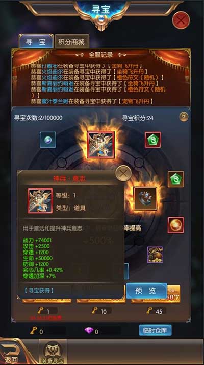 【神兵】、【暮色靈戒】、【暮色靈鐲】向來是各職業(yè)戰(zhàn)神們求之不得的裝備之一,七階的評級使其的屬性更為奪人眼球,實屬稀缺。眾人的尋寶之路不得而返增加了奇跡出現(xiàn)的幾率,當全服出現(xiàn)提高500%時,機不可失失不再來,定要好好抓緊此次機會獲取強裝登頂戰(zhàn)神之巔。