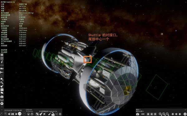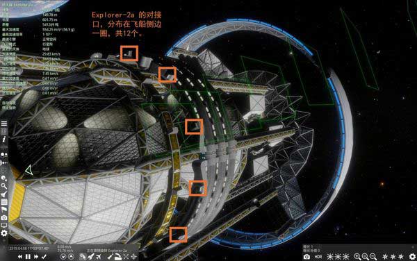 Space Engine自帶的航天器中,只有恒星際飛船Explorer-2a與航天飛機(jī)Shuttle可以進(jìn)行對(duì)接。Explorer-2a的對(duì)接口共12個(gè),圍繞在飛船中部外圍;Shuttle的對(duì)接口只有一個(gè),在飛機(jī)尾部。
