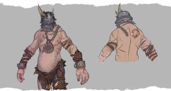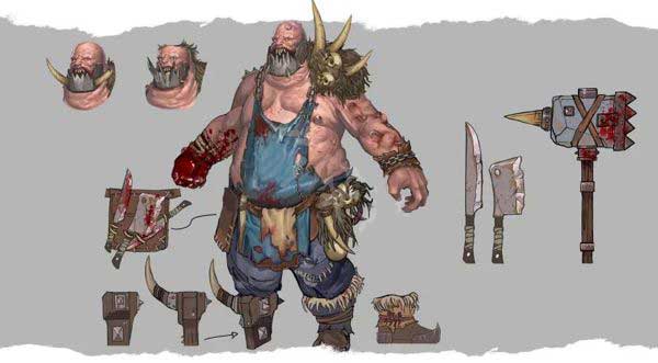 屠戶比一般的食人魔更加壯碩,而且也更加埋汰。他們就像長了腿的食物柜一樣,身上不僅糊著干血,掛著下水,而且還飾有大肉,同時(shí)也會(huì)有肉鉤、剁肉刀、剔骨刀以及特制的嫩肉劑,這些東西要么別在皮圍裙里,要么就是插在他們那松垮的皮膚上。