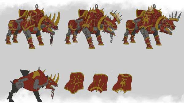 某些情況下,一位特別受寵愛的恐虐軍鋒先驅(qū)會(huì)受賜一頭鋼鐵斗牛。這是一種巨大的野獸,由鋼鐵和黃銅組成,它比人還高,其力量足以碾殺面前的敵人,從而為主人的目標(biāo)獻(xiàn)上助力。