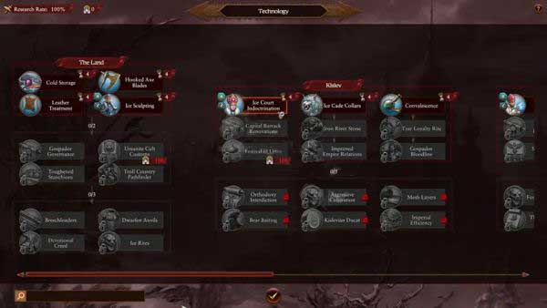 基斯里夫的科技主要有四大部分——國土與三座大型城市。每一部分都包含三組科技,每一組都需要幾條前面的科技來解鎖。在一組科技中,也會(huì)有幾條科技是連著的。