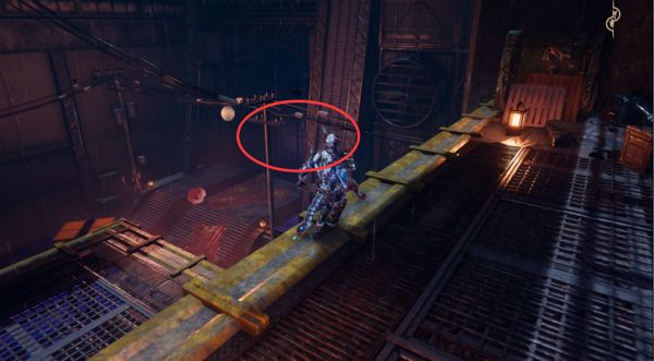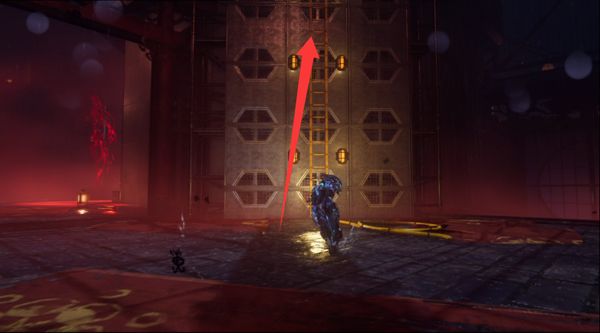 清理完埋伏在這的妖魔,然后回頭從樓梯上到上方平臺(tái)。