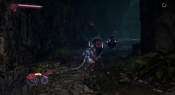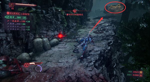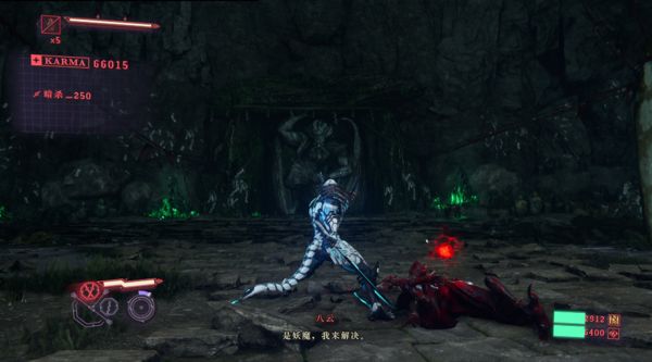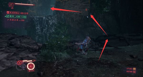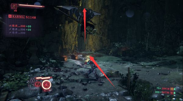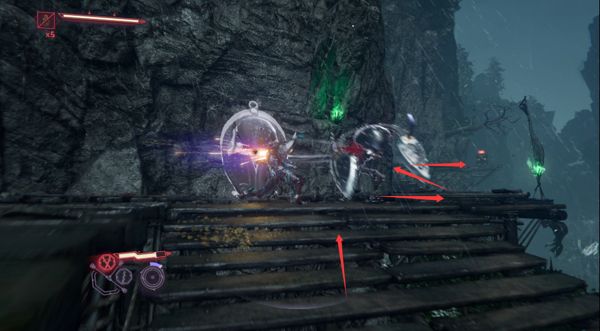 在這雕像之前,擁有大量的敵人,我們盡量用魔鉆追擊飛天敵人,然后用雙刀擊殺地面強(qiáng)敵,頻繁使用強(qiáng)化形態(tài)可以有效破除敵方霸體。