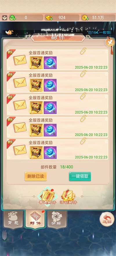 1、來到游戲內(nèi)就可以領(lǐng)取到歷史所有玩家的首通獎勵。