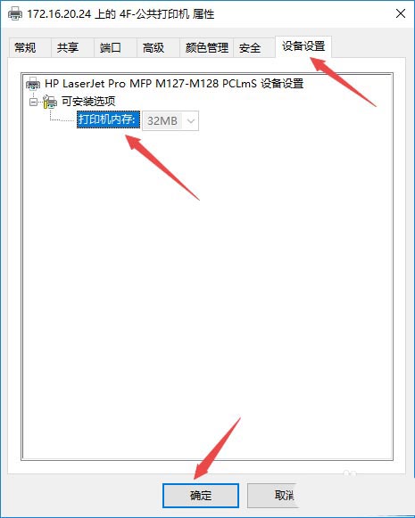 7、之后我們點擊設(shè)備設(shè)置,然后我們就可以看到打印機(jī)內(nèi)存了,之后我們點擊確定即可。