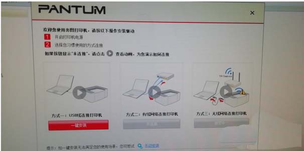 2、選擇安裝方式,如圖USB數(shù)據(jù)線已經(jīng)連接打印機(jī)??梢赃x擇方式一,進(jìn)行一鍵安裝。