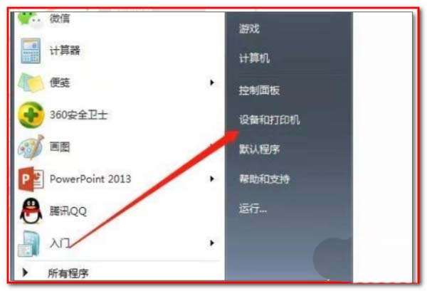 1、首先點(diǎn)擊電腦開始菜單,點(diǎn)擊“設(shè)備和打印機(jī)”。