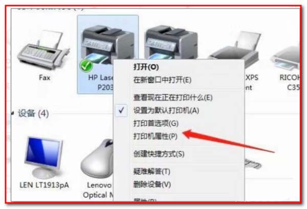 2、然后點(diǎn)擊電腦使用的打印機(jī),然后右鍵點(diǎn)擊“打印機(jī)屬性”。