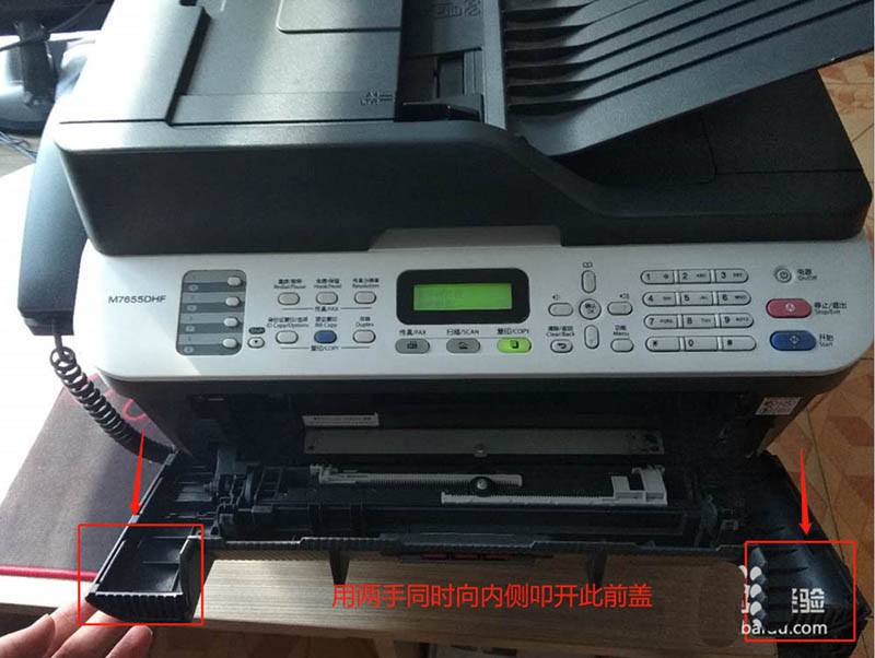 2、然后兩個(gè)手分別從打印機(jī)兩側(cè)向內(nèi)側(cè)叩開前蓋。如下圖