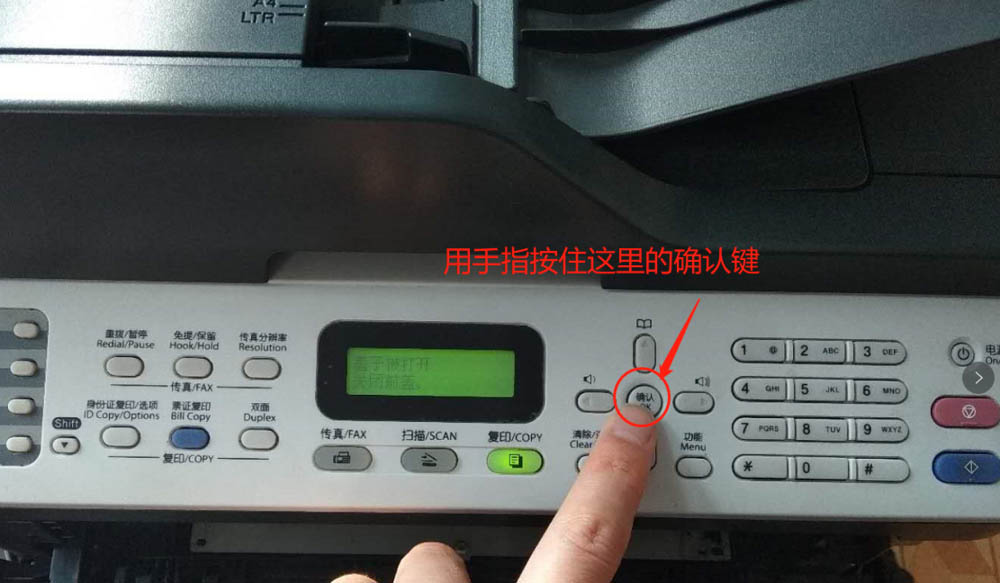 3、用手指按住打印機(jī)鍵盤上的“確認(rèn)”鍵不放。