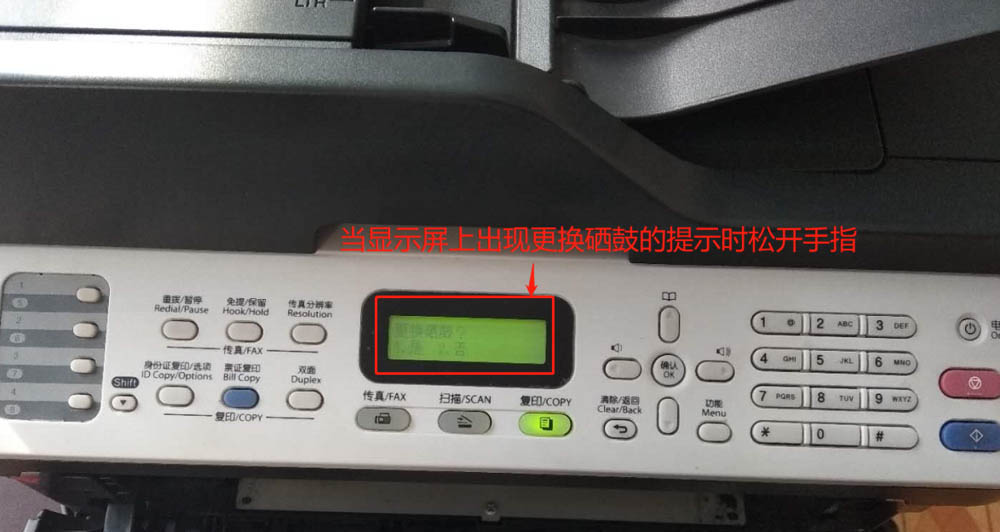 4、當(dāng)顯示屏上出現(xiàn)更換硒鼓的提示時(shí)松開手指。