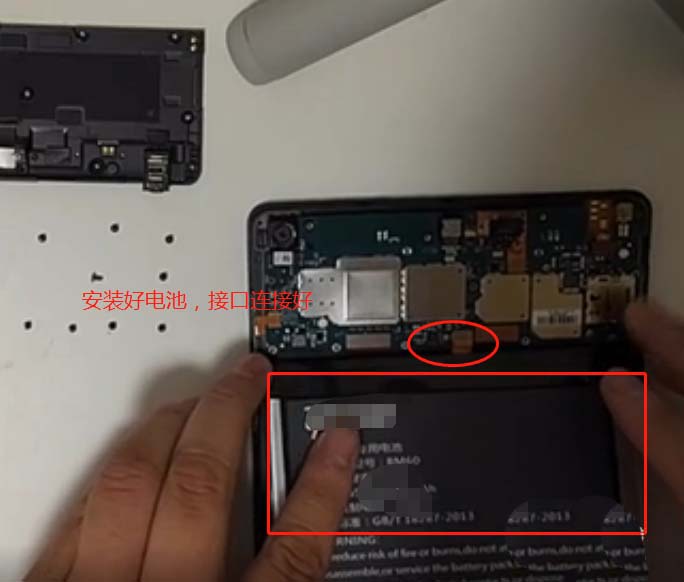 9、拆下來之后,再將新買的電池背面貼好膠布平穩(wěn)放在平板電腦上,然后接好電池數(shù)據(jù)線接口,如圖所示: