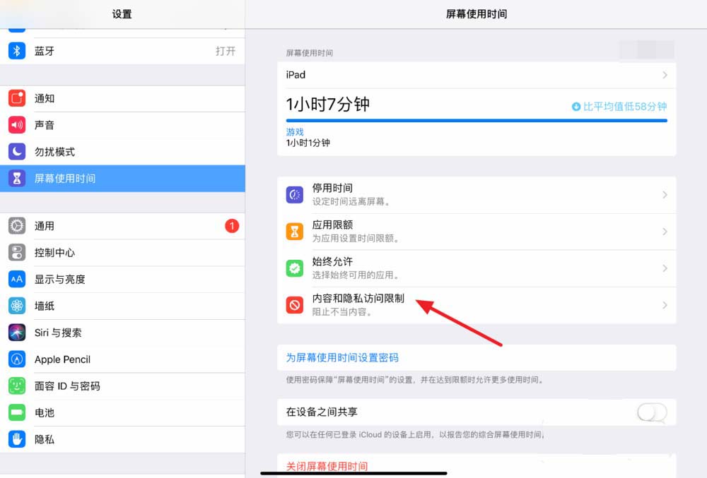 3、接著找到屏幕使用時(shí)間下的內(nèi)容和隱私訪問(wèn)限制