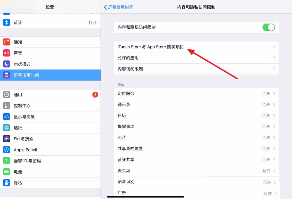 4、進(jìn)入后,可以直接關(guān)閉內(nèi)容和隱私訪問(wèn)限制,如果只想關(guān)閉禁止刪除APP的功能,選擇iTunes Store與App Store購(gòu)買項(xiàng)目