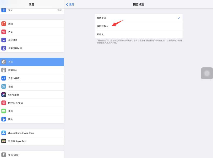 5、系統(tǒng)默認(rèn)隔空投送處于關(guān)閉狀態(tài),根據(jù)自己的情況,可以選擇僅聯(lián)系人或者所有人