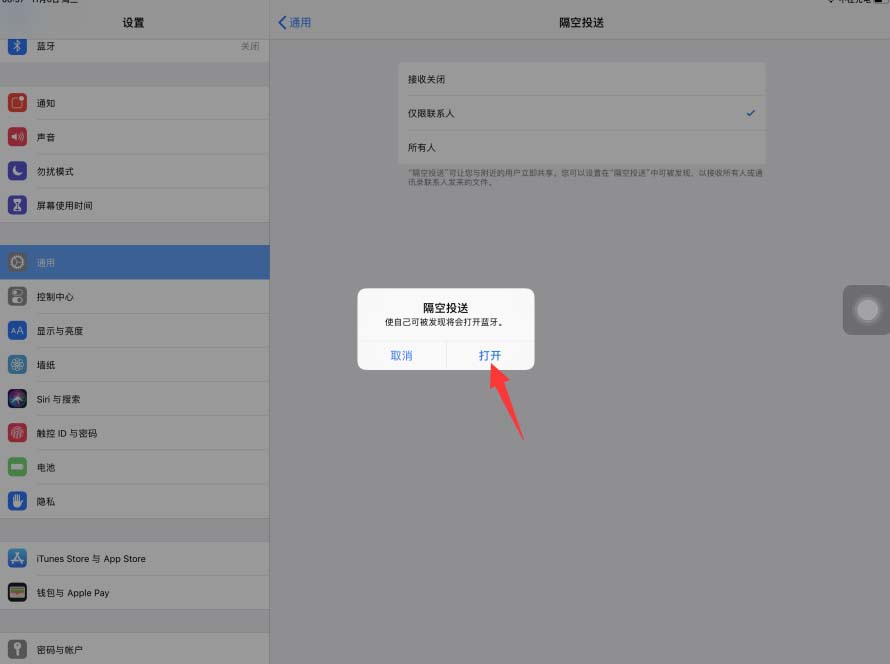 6、這時(shí),系統(tǒng)將彈出一個(gè)提醒窗口“隔空投送使自己可被發(fā)現(xiàn)將會打開藍(lán)牙。”點(diǎn)擊打開