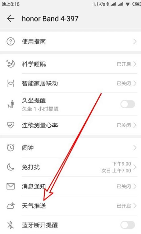 4、這時會打開華為手環(huán)的詳細(xì)頁面,點(diǎn)擊天氣推送的設(shè)置項(xiàng)。