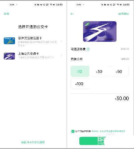 5、選擇需要添加的公交卡,目前支持京津冀和上海公交卡,后續(xù)會逐漸加入更多城市。這里選擇上海公交卡,選擇金額,點擊已閱讀并同意協(xié)議選項后,點擊支付按鈕。支付完成后,進入開卡頁面,實際需要不到1分鐘。手機端就可以顯示已添加的公交卡了。