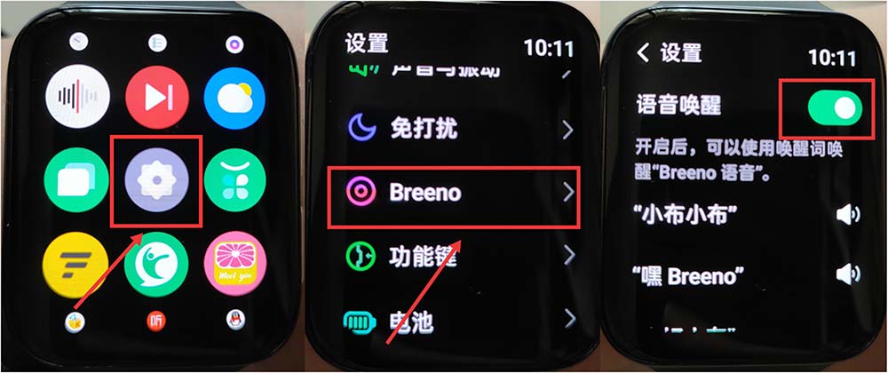 在手表應(yīng)用桌面上找到“設(shè)置”并點擊進入>“Breeno”>開啟“語音喚醒”