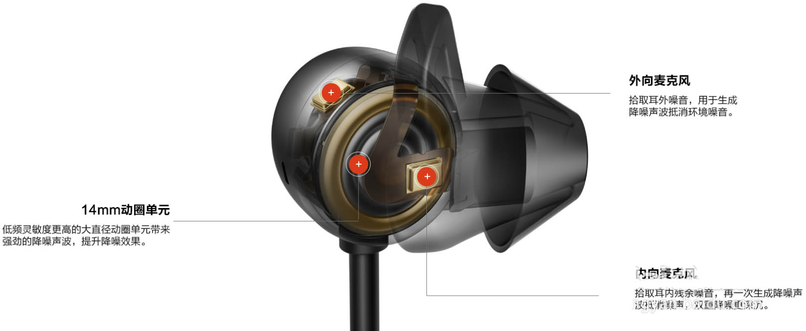 每只耳機(jī)里都內(nèi)置2顆高靈敏度麥克風(fēng),外向麥克風(fēng)拾取耳外噪聲,內(nèi)向麥克風(fēng)拾取耳內(nèi)殘余噪聲,隨后通過喇叭以生成反向降噪聲波來抵消噪聲,進(jìn)而最大幅度的提升降噪效果,也提升了降噪聲波的準(zhǔn)確性。