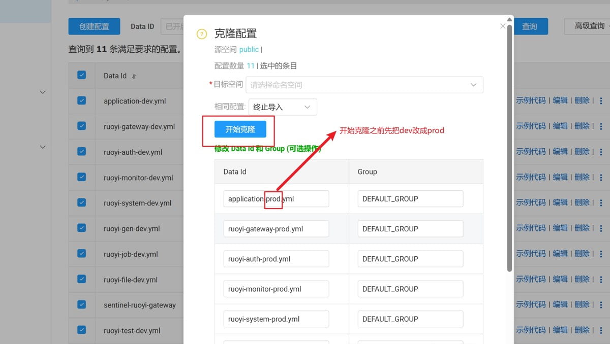 注意:克隆到dev的內(nèi)容不變,克隆到prod的內(nèi)容要修改一下:把dev改成prod如圖所示