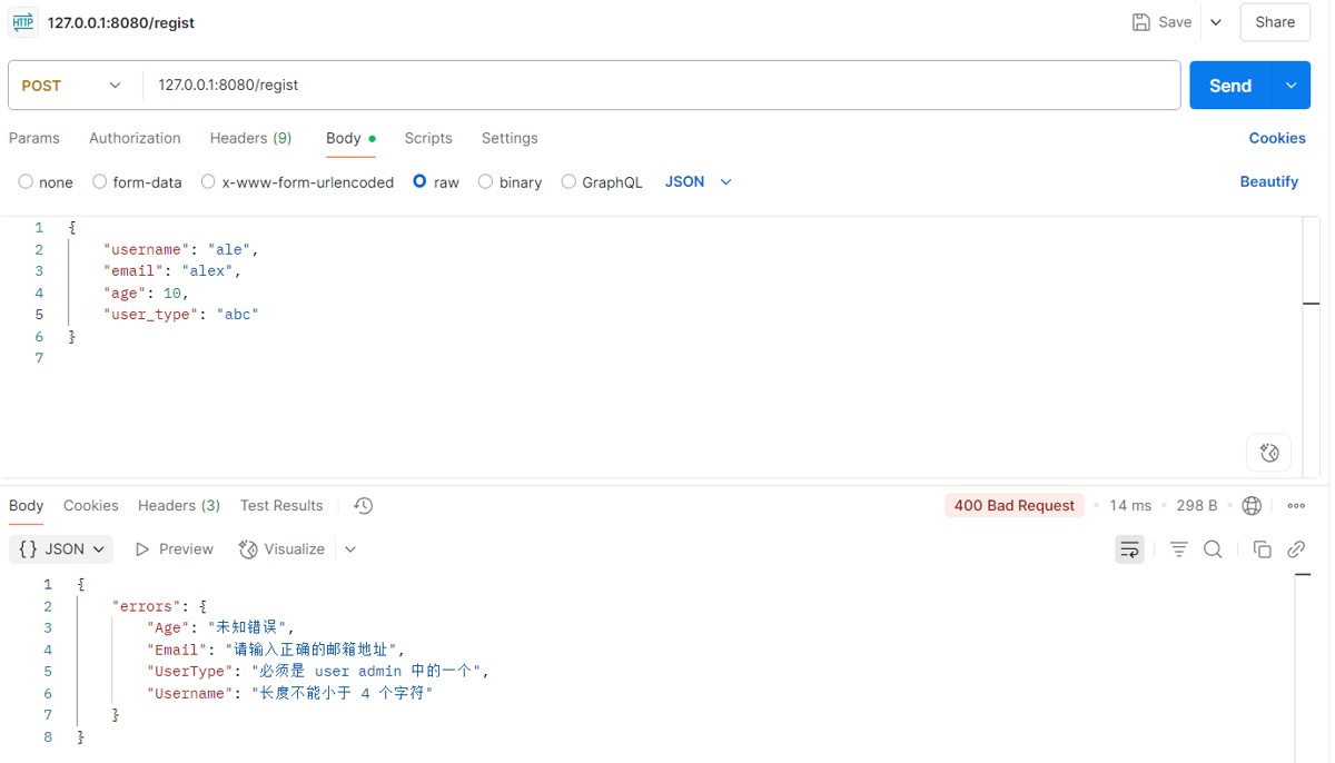 // 比如:{"Username": "長度不能小于 4 個字符"}