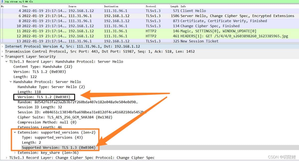 從這兩張圖上應(yīng)該可以看出:TLS1.2與TLS1.3 的握手報(bào)文中version字段填充的都是0x0303,也就是TLS1.2版本,如果是TLS1.3,則是通過擴(kuò)展字段supported_version來確定的。