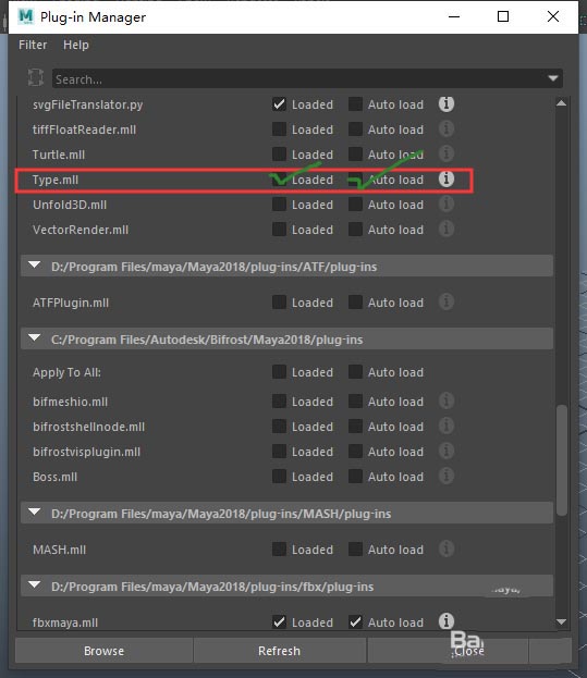3、在插件管理器中找到type.mll,勾選后面的選項(xiàng)