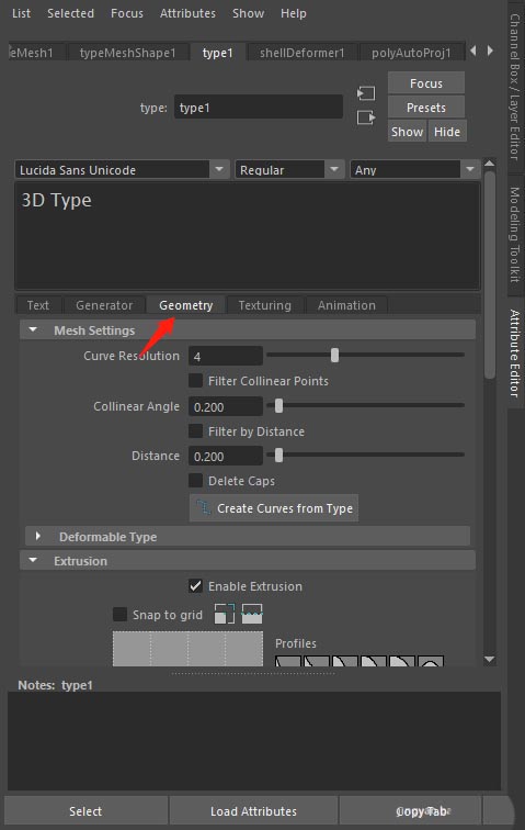 7、在geometry選項(xiàng)中可以修改擠出文字的屬性