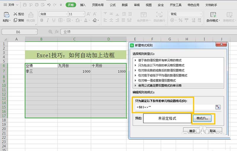 5、在下圖黃色框所圈起來的區(qū)域內(nèi)輸入=$B3<>""即可,然后點擊格式。