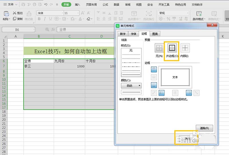7、如下圖所示,最終再點擊確定按鈕,然后在空白單元格內(nèi)輸入內(nèi)容即可完成外邊框的自動添加。