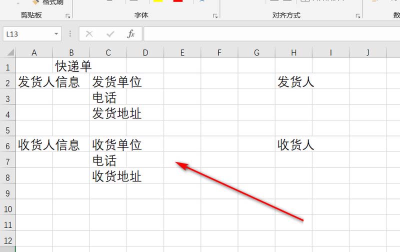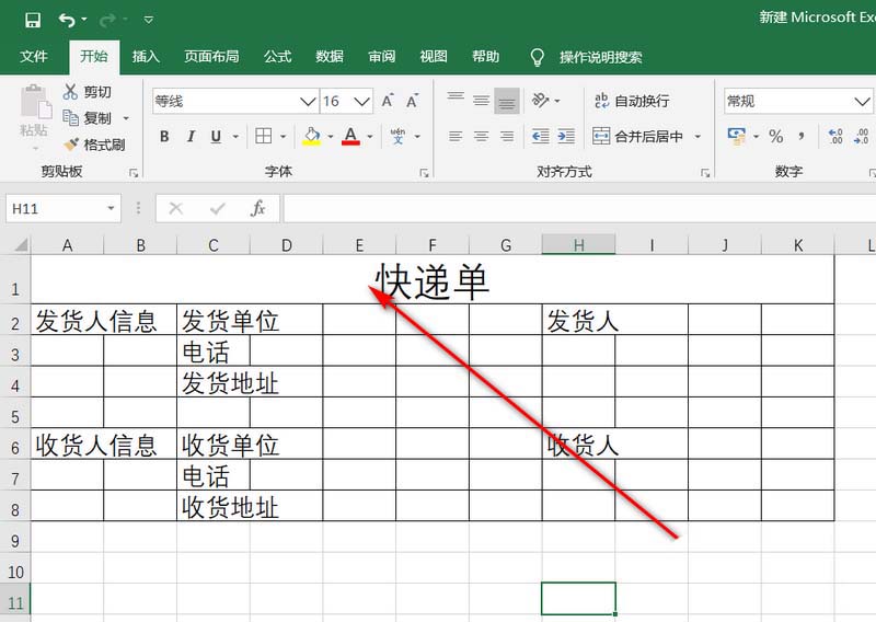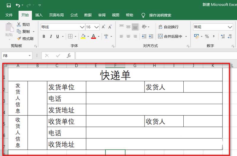 3、將【快遞單】字樣進(jìn)行合并居中,并且所有單元格加入邊框。