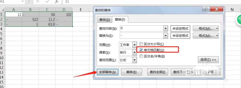 按住“Ctrl+F”調(diào)出查找替換窗口,接著選擇“選項(xiàng)”并勾選“單元格比配”然后查找中輸入“0”替換中輸入“-”點(diǎn)擊“全部替換”即可