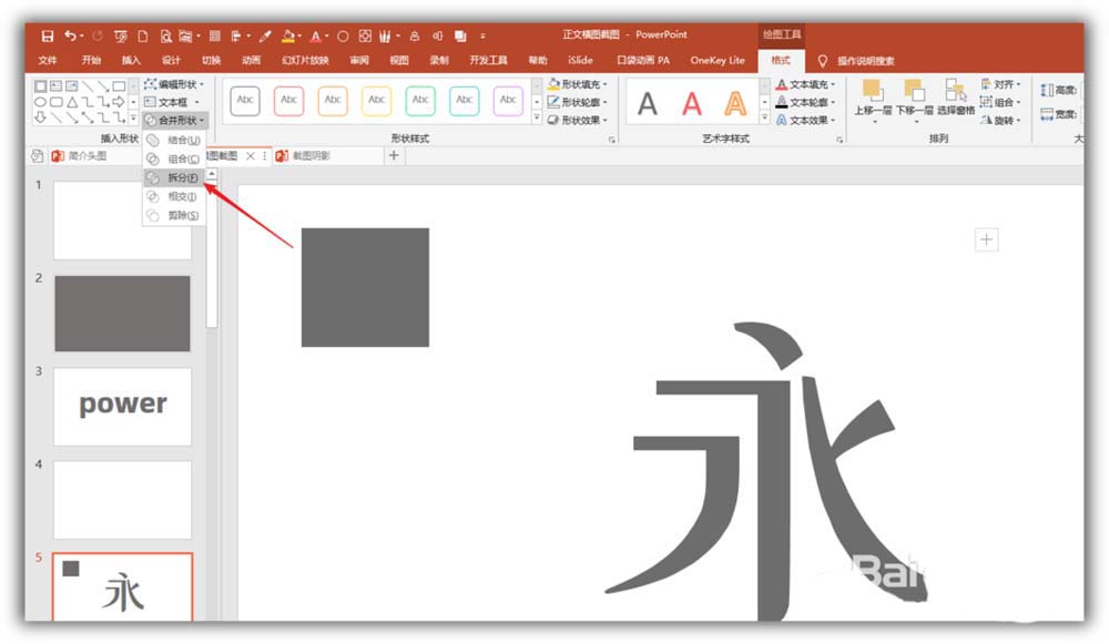 4、在頁面的任意位置插入一個(gè)形狀,選中形狀和文字,執(zhí)行形狀拆分。