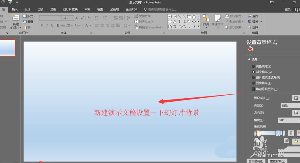 1、創(chuàng)建一個新的PPT演示文稿,然后設置幻燈片頁的填充效果,設置一個漸變的填充顏色。