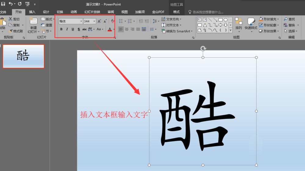 2、插入一個文本框,在文本框中輸入一個文字,然后在文字格式中設置文字的大小與字體等。
