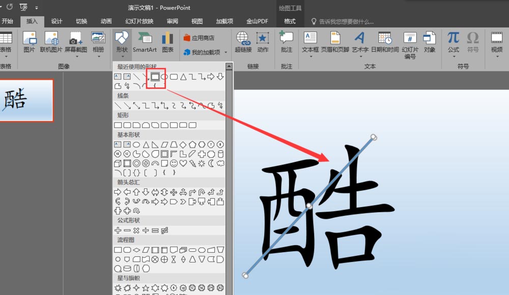 3、通過插入菜單插入一個矩形條出來,將繪制的矩形條進行旋轉操作,并將旋轉后的矩形條放到文本框文字的上面。
