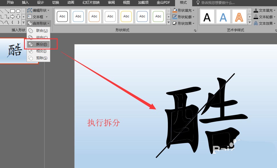 4、先選中文本框文字,在按住Ctrl加選矩形條,打開格式設置,執(zhí)行合并形狀中的“拆分”命令。