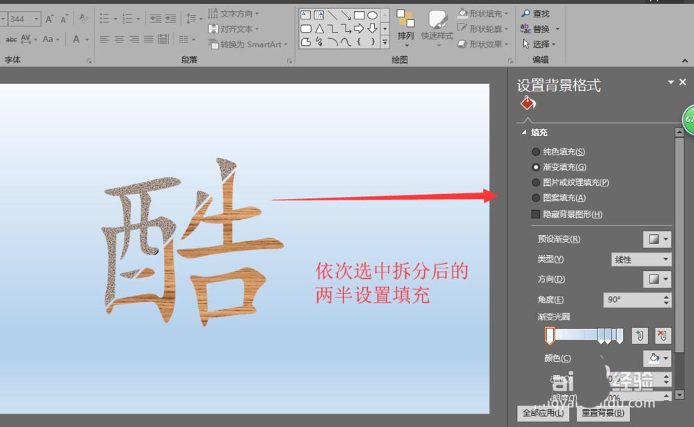 6、依次選中拆分為兩半的文字,設置填充效果,為其填充不同的顏色或圖片與紋理等效果。就可以完成我們最終的炫酷文字的制作。
