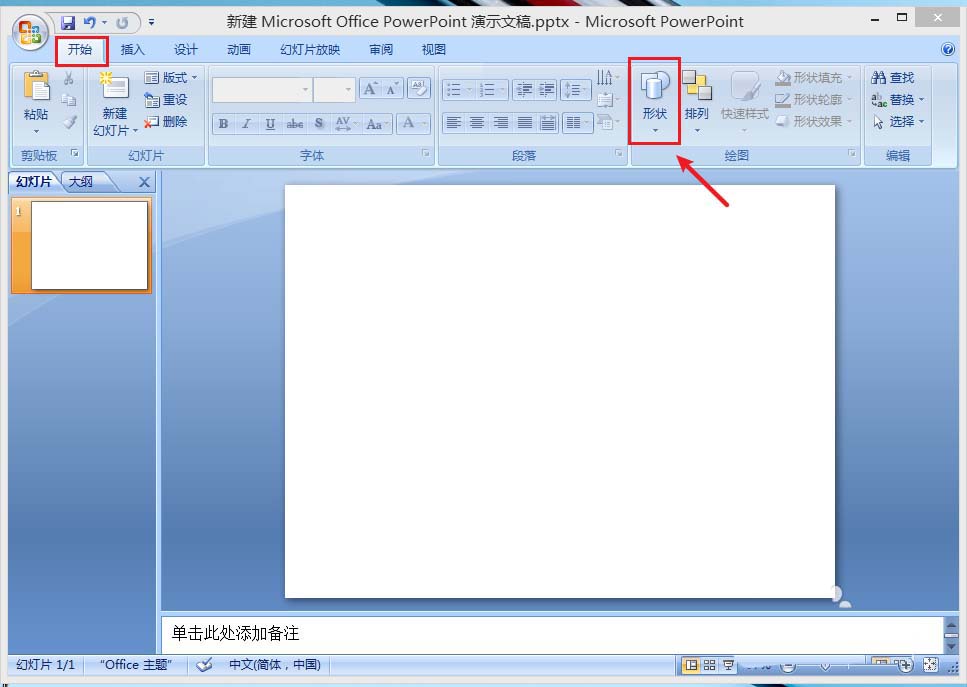 1、電腦打開(kāi)PPT,在開(kāi)始工具欄下方,點(diǎn)擊繪圖的“形狀”。