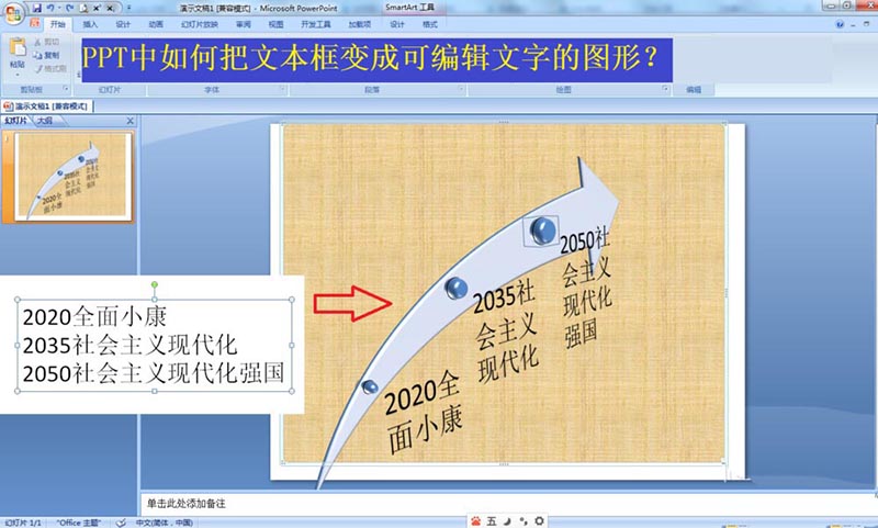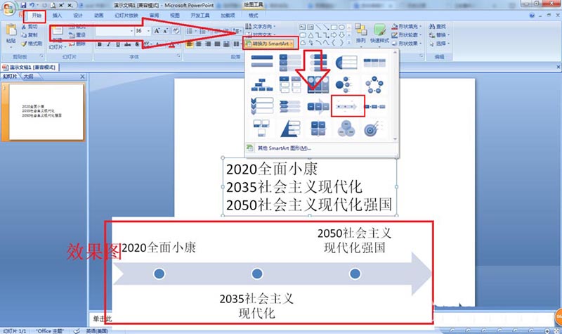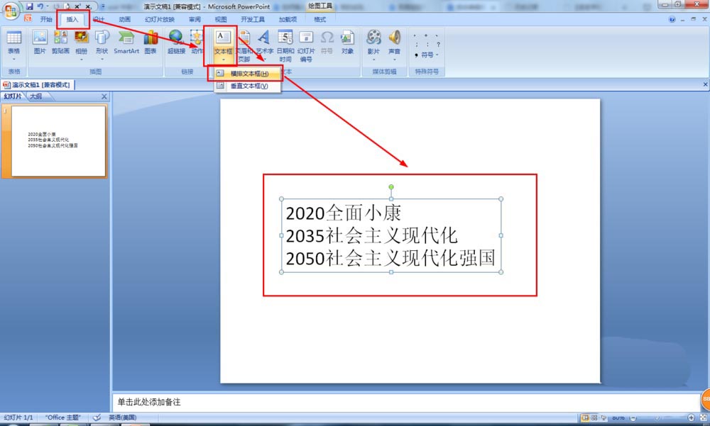 1、如圖在PPT2007中已經(jīng)點(diǎn)擊插入——文本框——橫排文本框——輸入了相應(yīng)年份的奮斗目標(biāo),這樣不直觀,變成圖形更直觀。