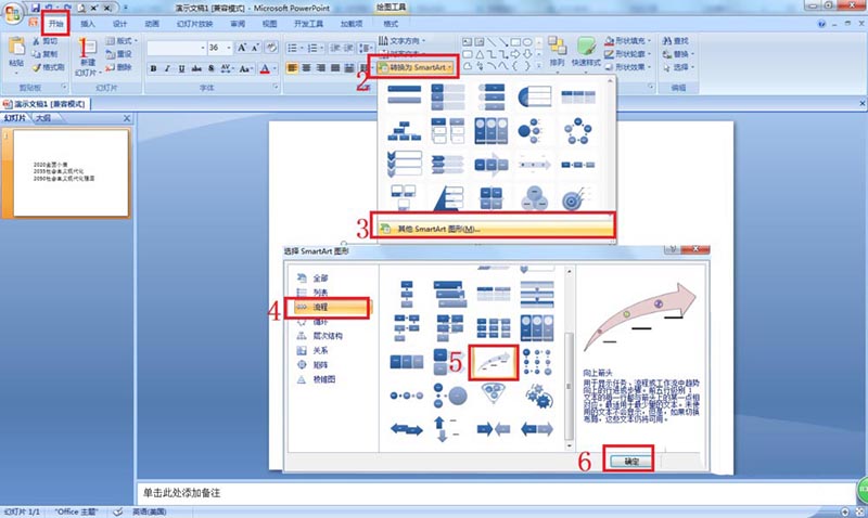 3、選擇更多類(lèi)型的SmartArt圖形:點(diǎn)擊開(kāi)始——選擇轉(zhuǎn)換為SmartArt——點(diǎn)擊其他SmartArt圖形——選擇合適的圖形后點(diǎn)擊:確定。
