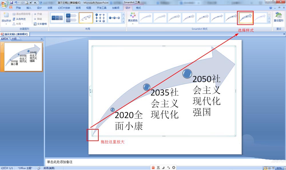 4)拖放設(shè)置大小——點(diǎn)擊設(shè)計(jì)選擇一種SmartArt樣式;