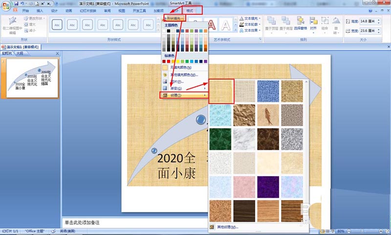 5、選擇格式——形狀填充——紋理——選擇一種紋理進(jìn)行填充(也可以選擇其它的填充方式),這樣就更像一幅圖片。