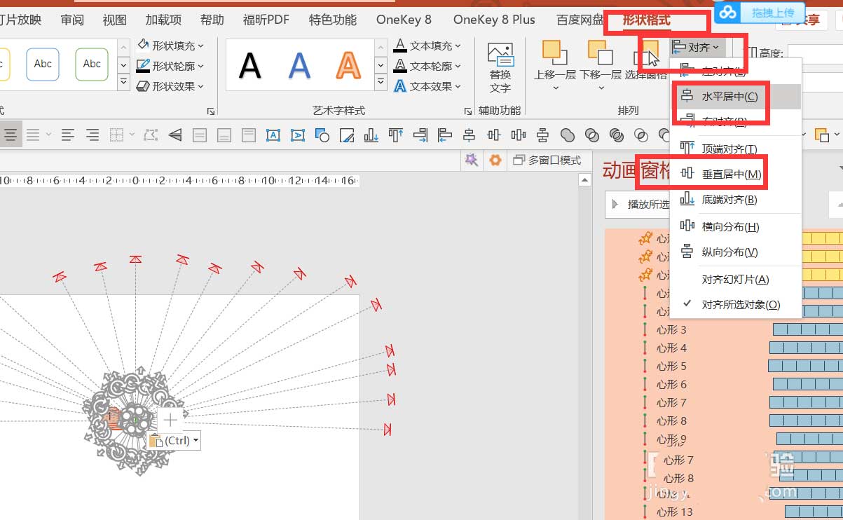14、全選愛(ài)心,點(diǎn)擊【形狀格式】-【水平居中】-【垂直居中】,如圖15