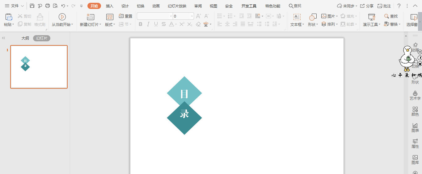 4、在兩個(gè)菱形中間輸入“目錄”兩個(gè)字,并設(shè)置好字體的顏色和大小。