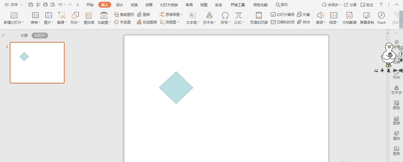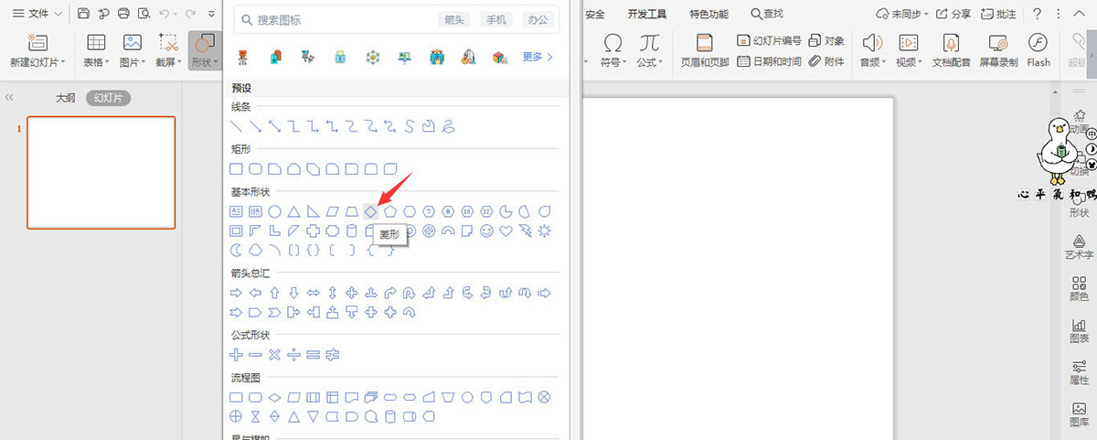 1、在插入選項(xiàng)卡中點(diǎn)擊形狀,選擇其中的菱形,在頁(yè)面上繪制出形狀。