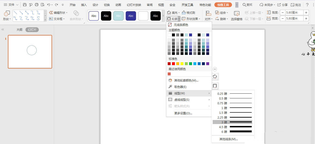 3、點(diǎn)擊輪廓,選擇其中的線型,線條寬度設(shè)置為3磅。