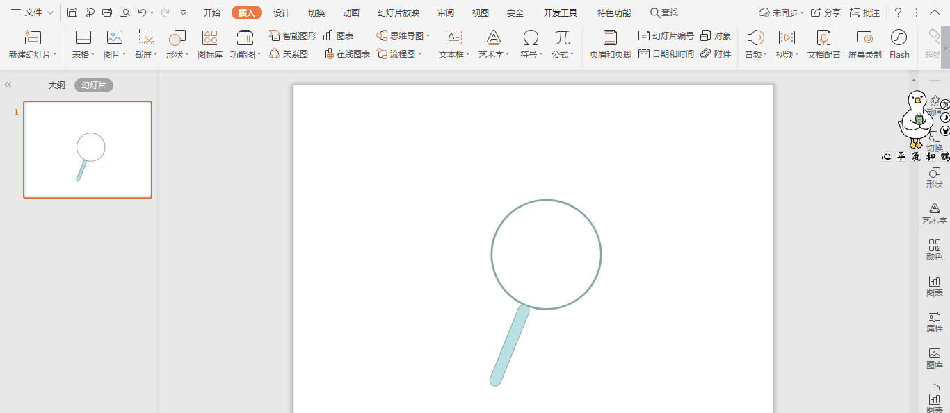 1、首先來制作放大鏡形狀:在插入選項(xiàng)卡中點(diǎn)擊形狀,選擇其中的橢圓,按住shift鍵,在頁面上繪制出一個正圓形。