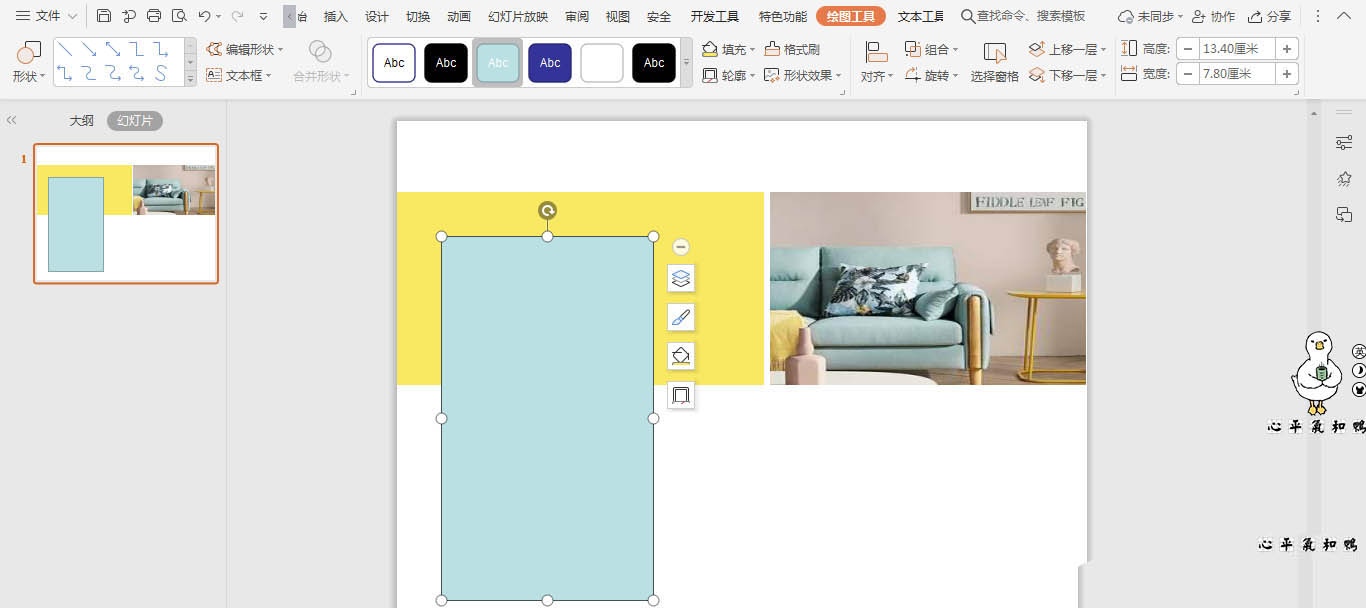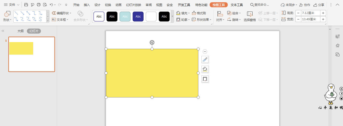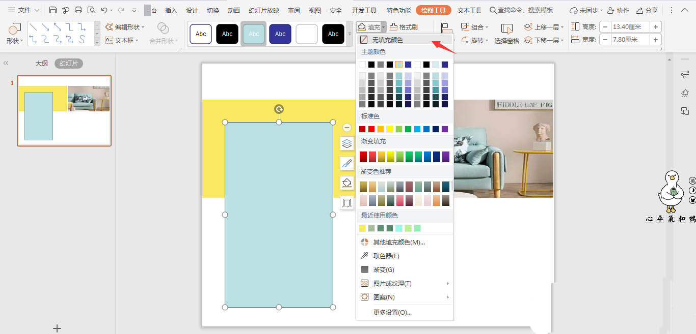 2、選中矩形,在繪圖工具中點(diǎn)擊填充,選擇溫暖的黃色進(jìn)行填充,并設(shè)置為無(wú)邊框。
